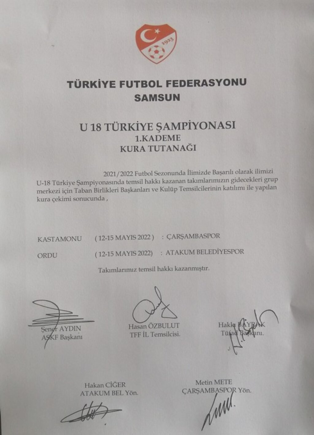 Samsun’dan U-18 Ligleri Türkiye Şampiyonasına katılmaya hak kazanan Atakum Belediyespor ve Çarşambaspor U18 Takımlarının temsilcilerinin katılımı ile grup merkezlerinin belirleneceği kura çekimi Samsun Amatör Kulüpler Federasyonunda yapıldı.