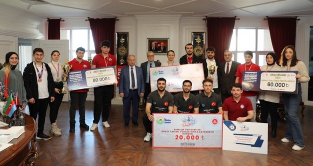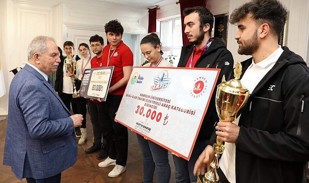 SAMSUN HABER - Başkanlık makamında gerçekleşen ziyarette TEKNOFEST yarışmasında desteklenen Yüksek İrtifa Kategorisinde ikinci olan “Samsun Roket Takımına” 20 bin TL ödülü, Elektrikli Araçlar Kategorisinde birinci olan Samsun Üniversitesi (SAMÜ-ELAR) takımına 30 bin TL’lik çeki Başkan Demirtaş takdim etti.