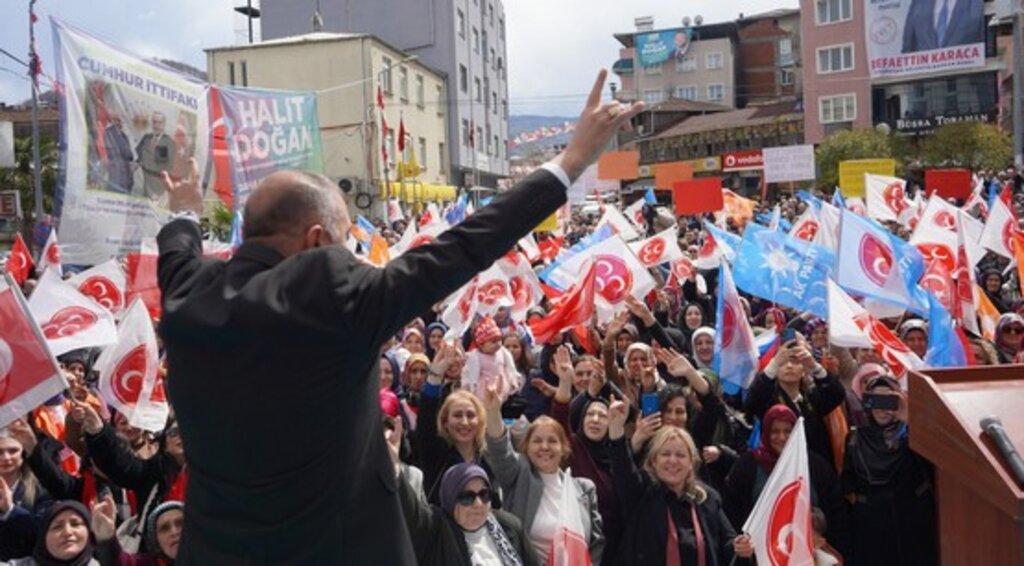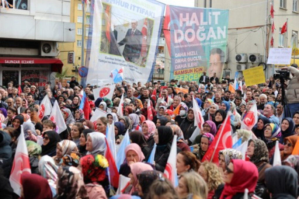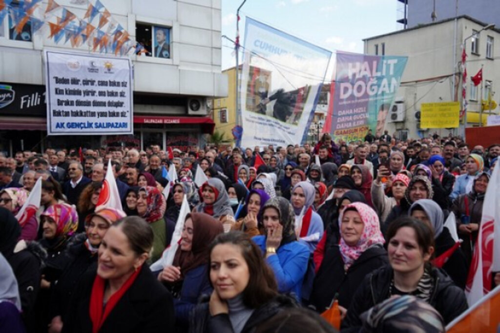 Biz, Cumhur İttifakı olarak Salıpazarı'na hizmet için geliyoruz. Biz dedik mi yaparız, yaptıklarımızın arkasında dururuz. Bundan yaklaşık bir ay önce veya daha kısa süre önce bu meydanda bir miting oldu. Hepiniz biliyorsunuz, değinmeden geçemeyeceğim. Cumhur İttifakı'nın iki partisi var: birisi Milliyetçi Hareket Partisi, diğeri AK Parti, başka yok. Genel seçimleri yerel seçimlerle karıştırmıyoruz. İşte Cumhur İttifakı burada, Devlet burada, vekiller burada, büyükşehir belediye başkan adayı burada. İşte Salıpazarı burada, işte meydan burada.