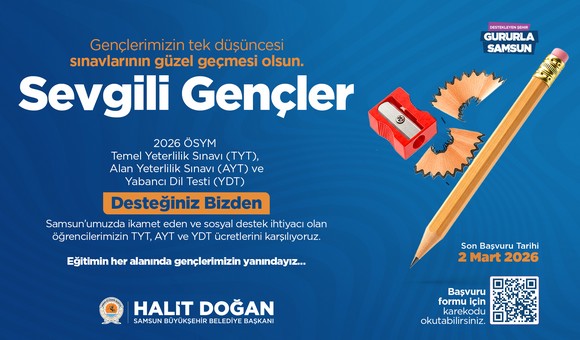 SAMSUN HABER - Her alanda şehrin gençlerini destekleyen Samsun Büyükşehir Belediyesi üniversite yolculuklarında da gençleri yalnız bırakmıyor. Bu kapsamda üniversite sınavına girecek olan ve gerekli şartları taşıyan öğrencilerin sınav ücretleri bu yıl da Büyükşehir Belediyesi tarafından ödenecek. Samsun Büyükşehir Belediye Başkanı Halit Doğan, “Üniversite yolculuğunda gençlerimize bir destek, bir katkı sunmak istedik. Onlar sadece hedeflerine odaklansın; biz her zaman, her alanda yanlarında olmaya devam edeceğiz” dedi.