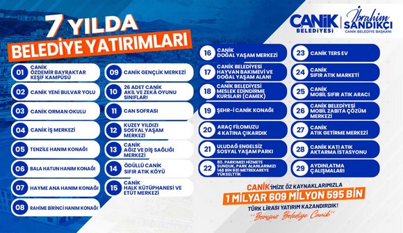 Karadeniz Bölgesi'nin en büyük macera parkı olma özelliğini taşıyan Canik Macera Parkı ve Canik Belediyesi Özel Çocuklar Misafirhanesi gibi yeni projelerin yapım ve tefrişat çalışmalarını yoğun bir şekilde sürdürdüklerine değinen Başkan İbrahim Sandıkçı, "Canik'imizde eser ve hizmet seferberliğimizi sürdürüyoruz. İlçemizin hem bugününe hem de geleceğine değer katan projeleri hizmete sunuyoruz. Büyük bir gayret ve azimle gerçekleştirdiğimiz çalışmalarla ilçemize belediyemiz öz kaynaklarıyla 1 milyar 609 milyon 595 bin Türk lirası değerinde yatırım kazandırdık. Planlı adımlarla yeni projeleri ve yatırımları hemşehrilerimizle buluşturmaya, her alanda daha güçlü bir Canik için çalışmaya, üretmeye ve ilçemize değer katmaya devam ediyoruz" şeklinde konuştu.
