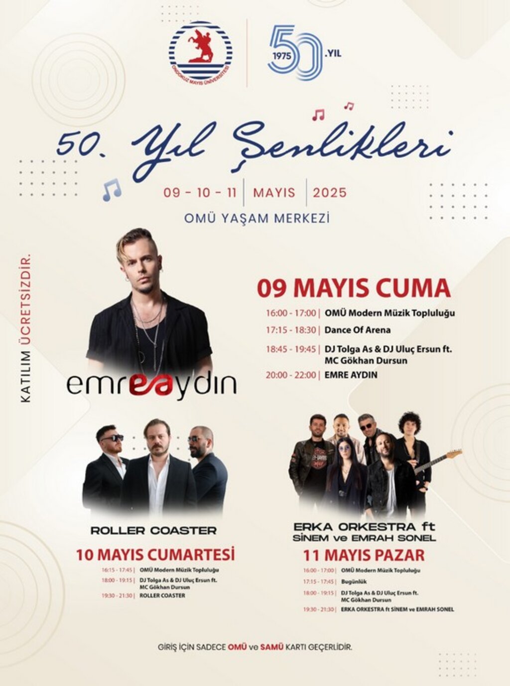 Kapanış konserinde ise “Erka Orkestra ft. Sinem ve Emrah Sonel”, OMÜ’nün 50. yılını müzikle taçlandıracak.