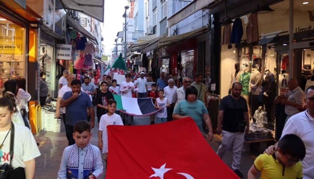 SAMSUN HABER - Siyonist İsrail'in Filistin'deki katliamlarına dikkat çekmek amacıyla temsili tabut ve kanlı çocuk kundaklarıyla Saathane Meydanında toplanarak, Fatih Sultan Mehmet ve Mecidiye Caddeleri üzerinden Samsun Cumhuriyet Meydanına yürüyen vatandaşlar, İsrail’in 7 Ekim’den bu yana yaptığı soykırım ve katliamları lanetledi. ‘‘İsrail’le Ticaret, Filistin’e İhanet’’ sloganlarının atıldığı yürüyüşte, çevredeki esnaflar ve vatandaşlar tarafından da alkışlarla destek verildi.