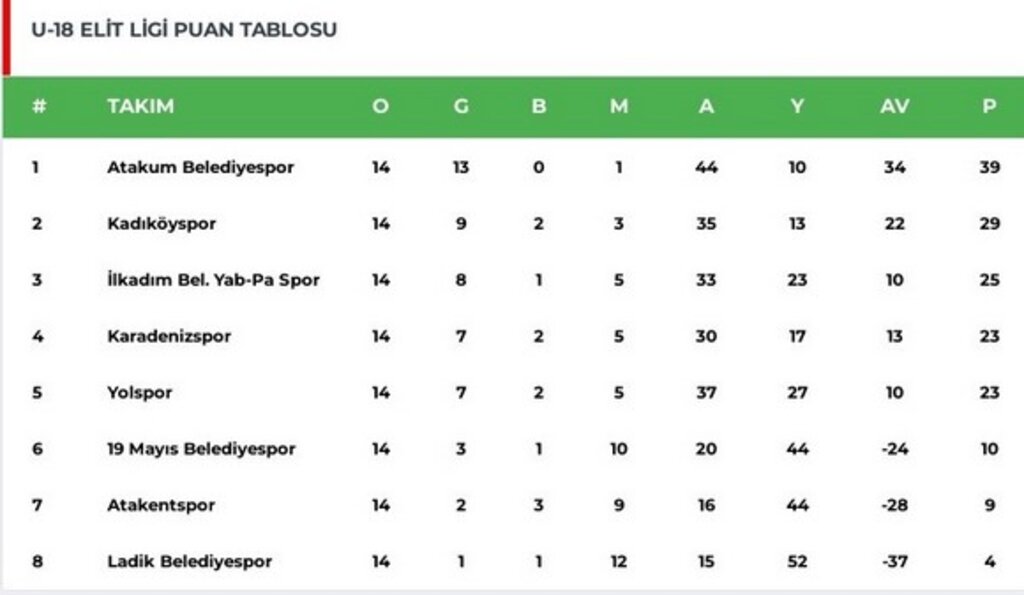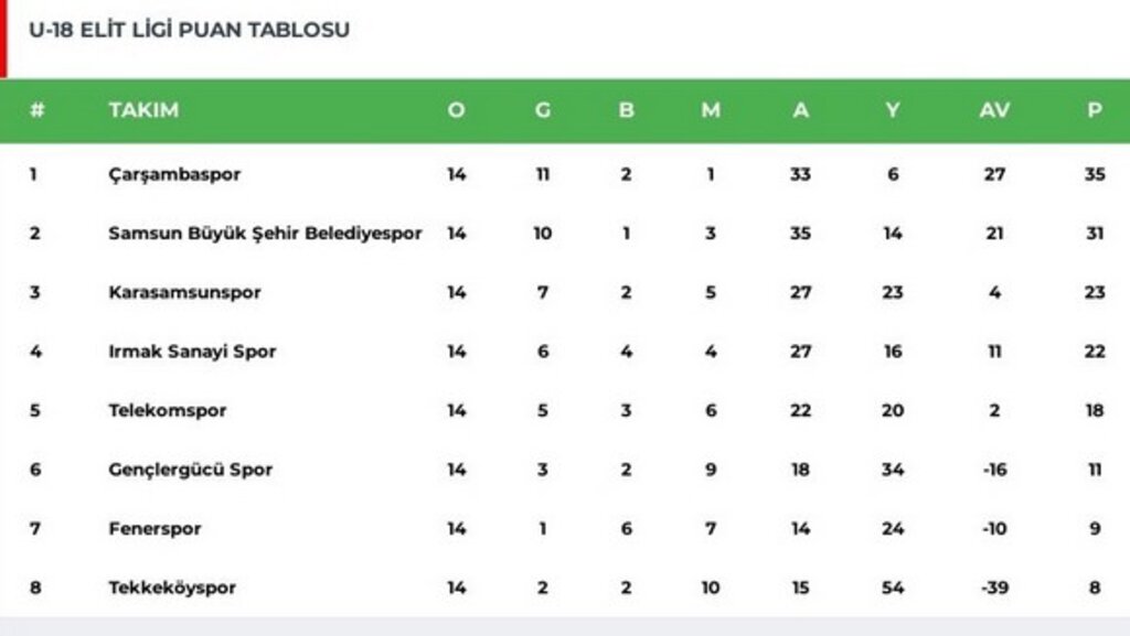 Samsun Amatör U18 Elit Liginde dün oynanan müsabakalarda alınan sonuçlar ve puan durumu şu şekilde: