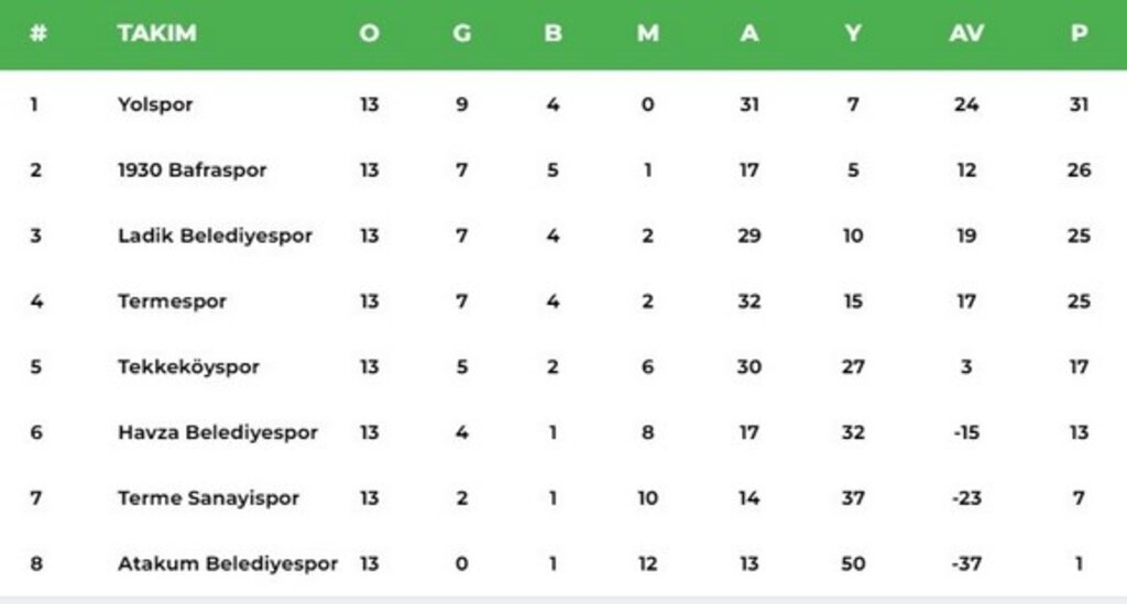 Samsun Süper Amatörde dün oynanan 13.hafta müsabakalarının sonuçları, son haftanın programı ve puan durumu şu şekilde:
