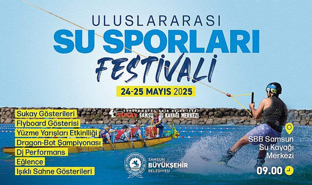 Samsun Büyükşehir Belediyesi ev sahipliğinde düzenlenen Uluslararası Su Sporları Festivali su sporları tutkunlarını Samsun’da buluşturuyor. Samsun’da ilk kez düzenlenecek festival 24 Mayıs Cumartesi günü Samsun Büyükşehir Belediyesi SUKAY Tesisleri’nde 09.00’da başlayacak. İki gün sürecek festival Samsun’un su sporu noktasındaki zenginliğini yansıtacak, su sporlarına gönül verenleri buluşturacak.