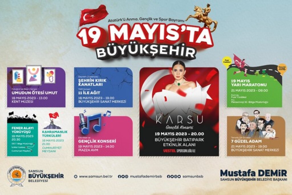 19 Mayıs’taki kutlamalarda ise Büyükşehir Belediyesi tarafından Piazza AVM’de saat 14:00’da Gençlik Konseri düzenlenecek. Yine aynı tarihte saat 20:00’da Büyükşehir Batıpark etkinlik alanında ünlü sanatçı Karsu ‘Gençlik Konseri’ kapsamında samsunlulara konser verecek.