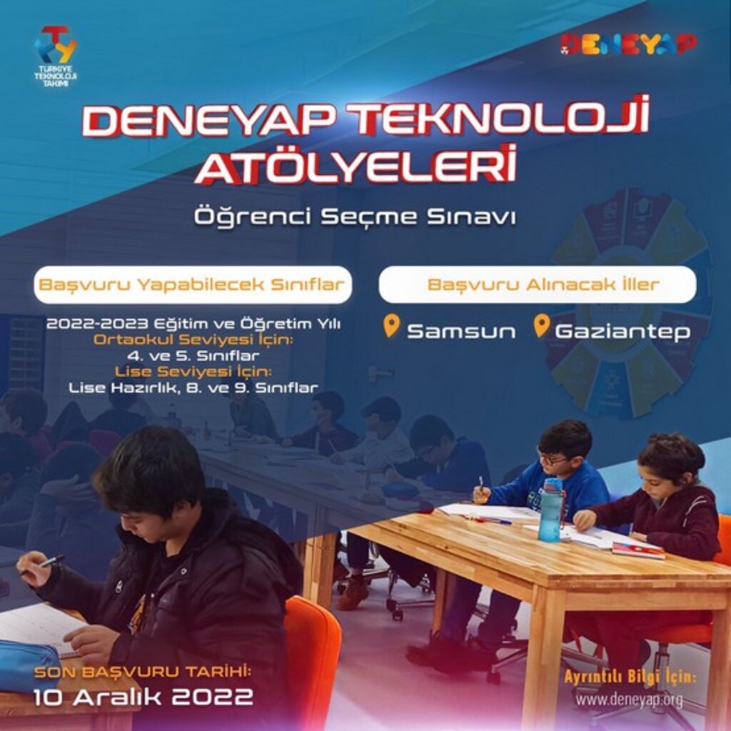 Geleceğin bilim insanlarının yetişeceği Canik Özdemir Bayraktar Keşif Kampüsü, Bilim Samsun ve Samsun Keşif Kampüsü’ndeki Deneyap Teknoloji Atölyelerinde 36 ay sürecek ücretsiz eğitimlerden yararlanmak isteyen ortaokul (4.sınıf ve 5. sınıf) ve lise (8. Sınıf, 9. Sınıf ve lise hazırlık sınıfı) öğrencilerimiz için son başvuru tarihi 10 Aralık 2022’ye uzatıldı.