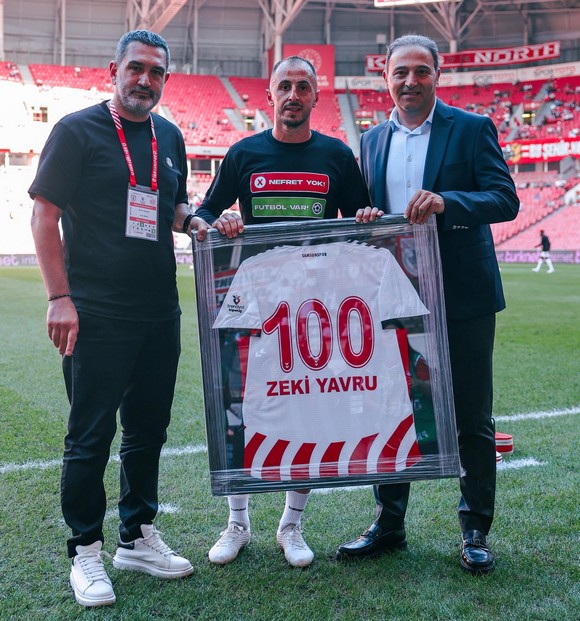 Samsunspor'da 100 maç barajını aşan kaptanı Zeki Yavru’ya plaket ve üzerinde “100” yazılı özel forma takdim edildi.