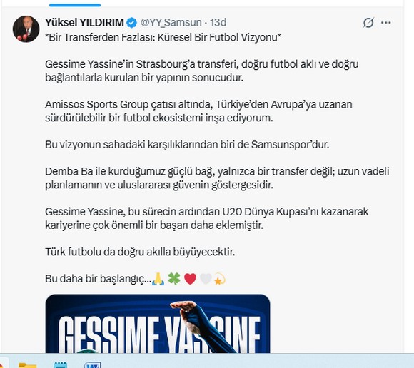 SAMSUNSPOR HABER – Samsunspor Başkanı Yüksel Yıldırım sosyal medya hesabından yaptığı paylaşımda “Türk futbolu da doğru akılla büyüyecektir. Bu daha bir başlangıç” dedi.