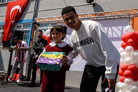 Kırmızı beyazlı oyuncular, öğrencilerle yakından ilgilenerek bol bol hatıra fotoğrafı çektirdi, imza dağıttı ve okul bahçesinde kurulan oyun alanlarında çocuklarla birlikte keyifli vakit geçirdi. Halı sahada oynanan maçlarla 23 Nisan coşkusu hep birlikte yaşandı.