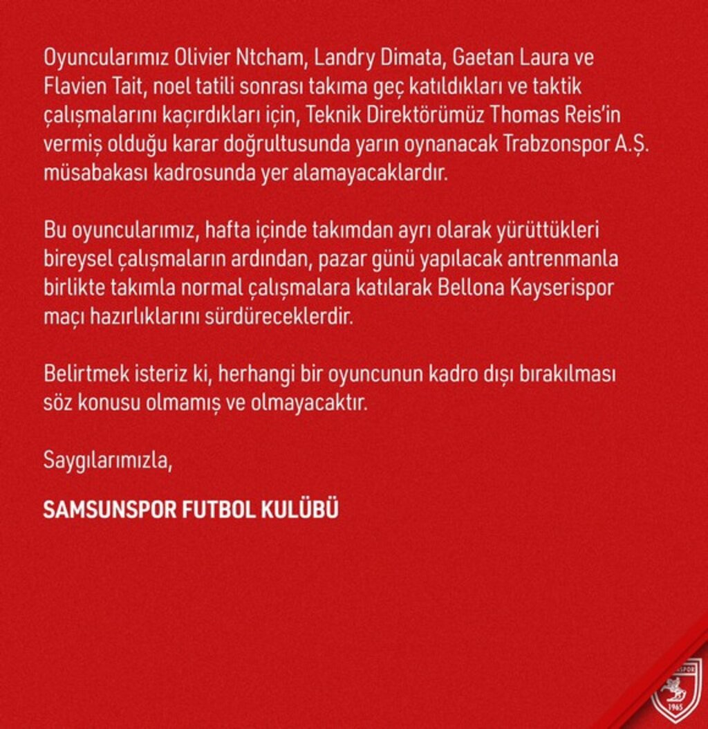 Samsunspor’da sakat oyuncu bulunmazken noel tatilinden geç dönen Ntcham, Dimata, Laura ve Tait, Teknik Direktör Thomas Reis tarafından bu maç kadrosuna alınmadı. Hafta içinde takımdan ayrı çalışan bu oyuncuların kadro dışı bırakılmadığı, Pazar gününden itibaren takım ile birlikte çalışmalara katılacakları belirtildi.