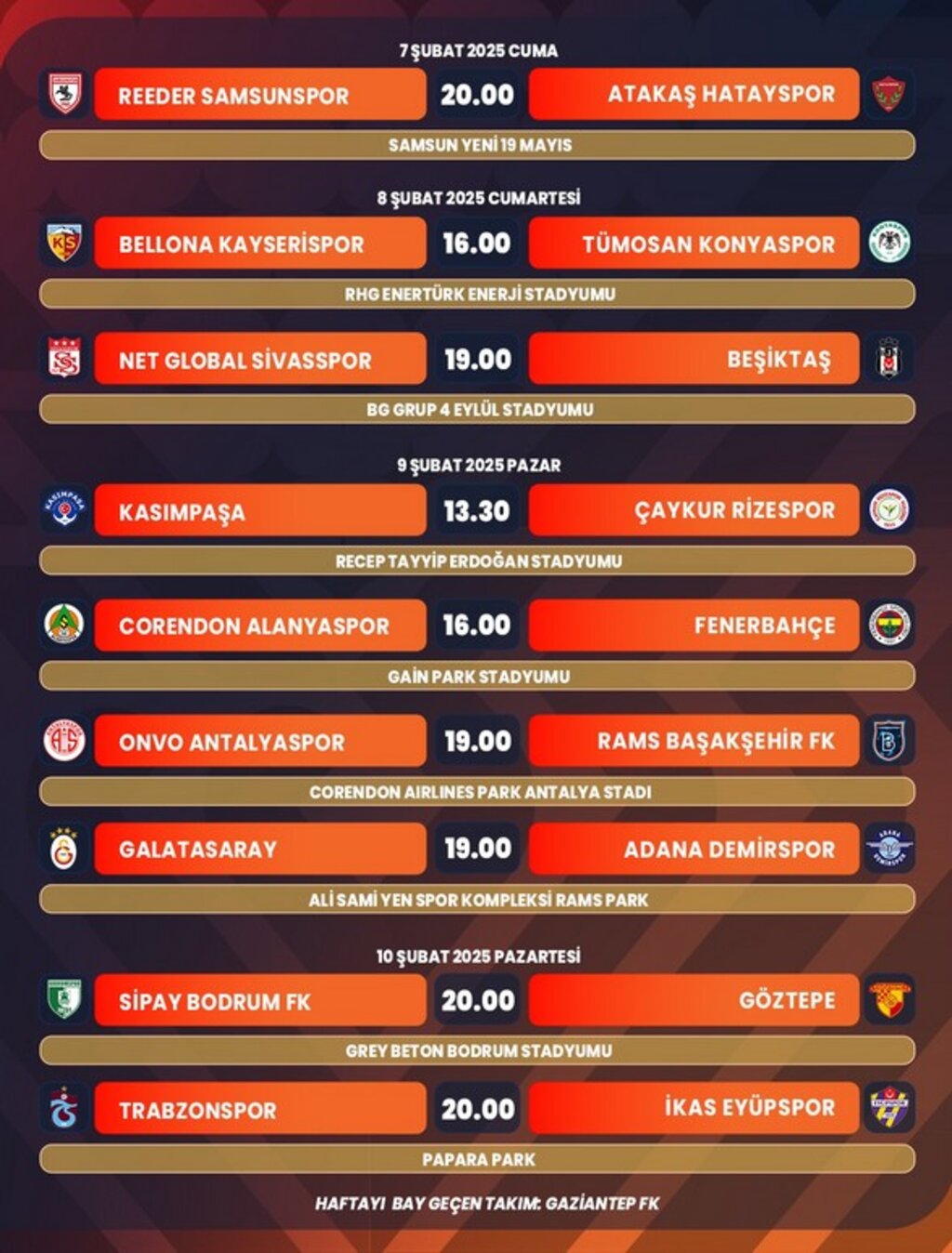 UEFA Avrupa Ligi'nde mücadele eden temsilcilerimizden, doğrudan Son 16 Turu'na yükselme ihtimali bulunan Galatasaray Spor Kulübü'nün; bu ihtimalin gerçekleşmesi ve 23. hafta sonrasında UEFA Avrupa Ligi Play-Off maçının olmaması halinde, yayın programı doğrultusunda, Trabzonspor A.Ş. - İkas Eyüpspor müsabakası 9 Şubat Pazar günü saat 19.00'a, Galatasaray A.Ş. - Adana Demirspor A.Ş. müsabakası ise 10 Şubat Pazartesi günü saat 20.00'ye alınacak.
