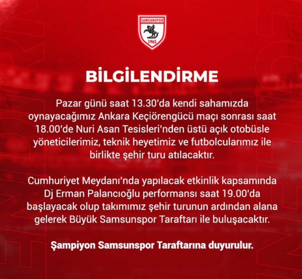 Şampiyonluk kutlaması ile ilgili kulüpten yapılan bilgilendirmede, “Pazar günü saat 13.30'da kendi sahamızda oynayacağımız Ankara Keçiörengücü maçı sonrası saat 18.00'de Nuri Asan Tesisleri'nden üstü açık otobüsle yöneticilerimiz, teknik heyetimiz ve futbolcularımız ile birlikte şehir turu atılacaktır. Cumhuriyet Meydanı'nda yapılacak etkinlik kapsamında Dj Erman Palancıoğlu performansı saat 19.00'da başlayacak olup takımımız şehir turunun ardından alana gelerek Büyük Samsunspor Taraftarı ile buluşacaktır. Şampiyon Samsunspor Taraftarına duyurulur” ifadelerine yer verildi. – Metin ATLI