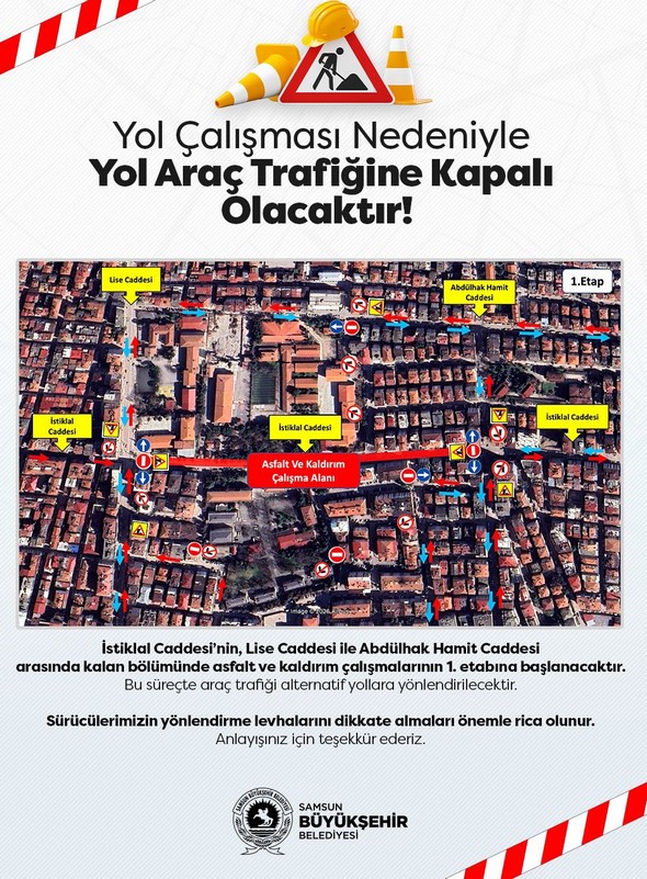 SAMSUN HABER – Samsun Büyükşehir Belediyesinin asfaltlama ve kaldırım çalışmaları nedeniyle İstiklal Caddesinin bir kısmı geçici olarak trafiğe kapatılacak.