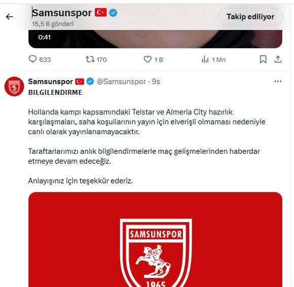 “Hollanda kampı kapsamındaki Telstar ve Almeria City hazırlık karşılaşmaları, saha koşullarının yayın için elverişli olmaması nedeniyle canlı olarak yayınlanamayacaktır. Taraftarlarımızı anlık bilgilendirmelerle maç gelişmelerinden haberdar etmeye devam edeceğiz. Anlayışınız için teşekkür ederiz.”