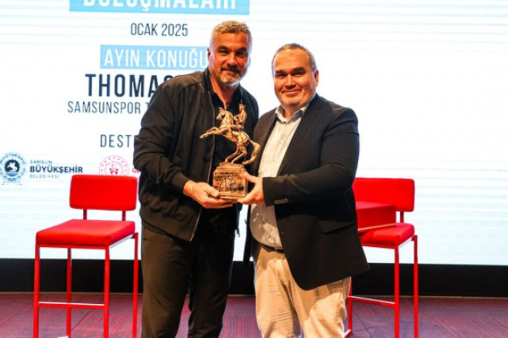 Etkinlik sonrası, Teknik Direktör Thomas Reis’e Samsun’umuzun simgesi Onur Anıtı hediye edildi.