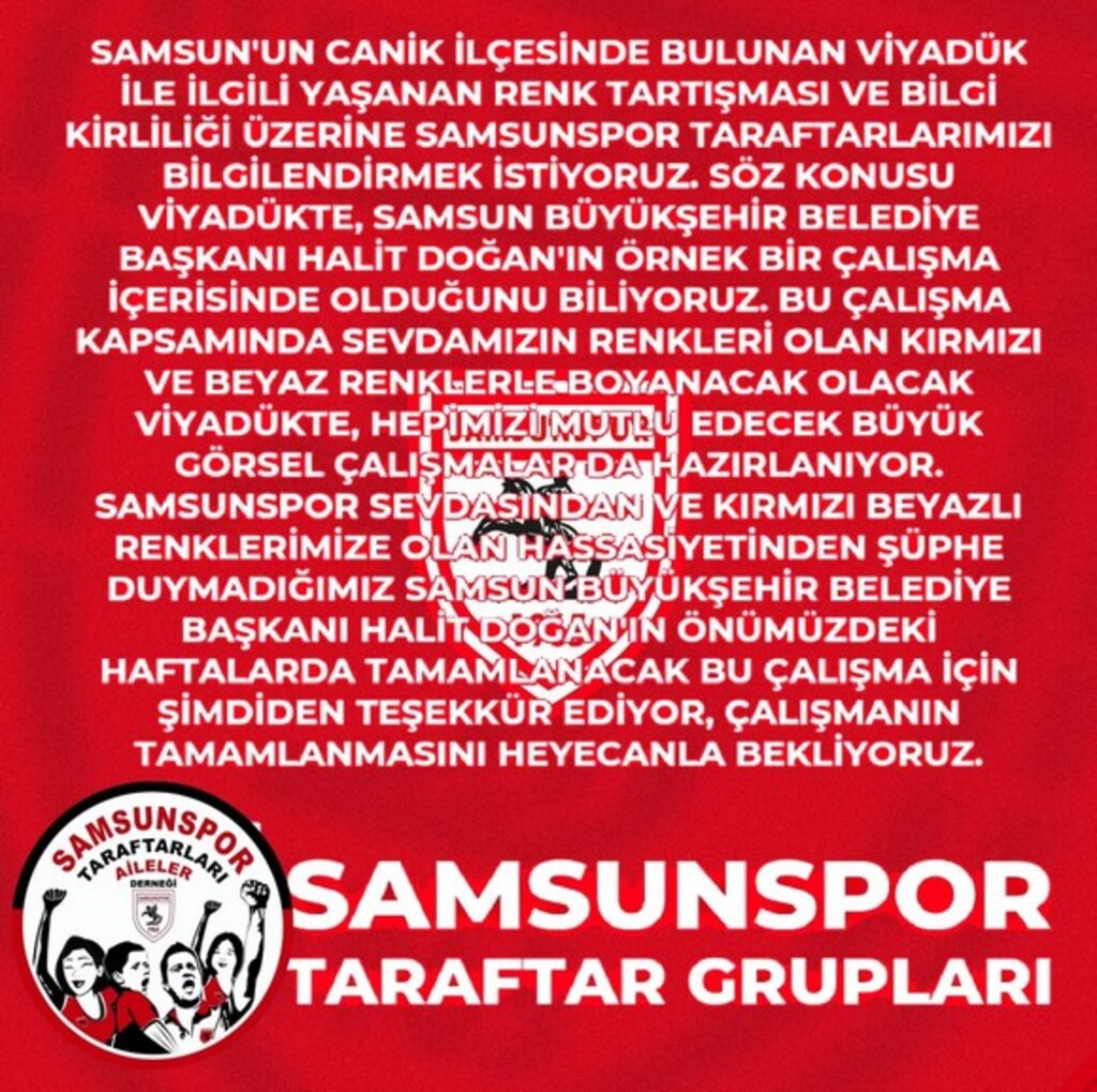 Samsunspor Taraftar Grupları tarafından yapılan ortak açıklamada, “Samsun'un Canik İlçesinde bulunan viyadük ile ilgili yaşanan renk tartışması ve bilgi kirliliği üzerine Samsunspor taraftarlarımızı bilgilendirmek istiyoruz. Söz konusu viyadükte, Samsun Büyükşehir Belediye Başkanı Halit Doğan'ın örnek bir çalışma içerisinde olduğunu biliyoruz. Bu çalışma kapsamında sevdamızın renkleri olan kırmızı ve beyaz renklerle boyanacak olacak viyadükte, hepimizi mutlu edecek büyük görsel çalışmalar da hazırlanıyor. Samsunspor sevdasından ve kırmızı beyazlı renklerimize olan hassasiyetinden şüphe duymadığımız Samsun Büyükşehir Belediye Başkanı Halit Doğan'ın önümüzdeki haftalarda tamamlanacak bu çalışma için şimdiden teşekkür ediyor, çalışmanın tamamlanmasını heyecanla bekliyoruz” ifadelerine yer verildi.